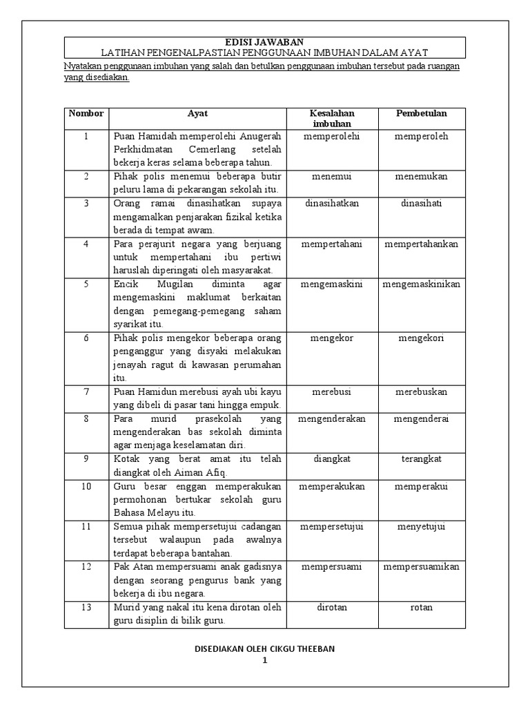 . Tahun 2 Bahasa Melayu Tatabahasa. Maksud dan Contoh Ayat K. JAWAPAN LATIHAN KESALAHAN EJAAN DAN IMBUHAN.